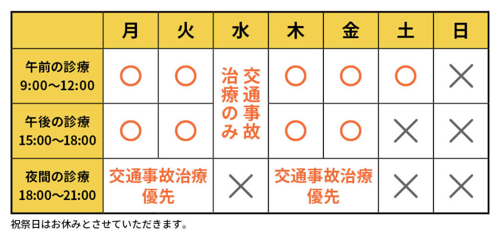 当院は足・膝・腰の治療を専門にしております。ご要望があれば首や肩の施術は可能ですが、専門ではないことをご了承ください。