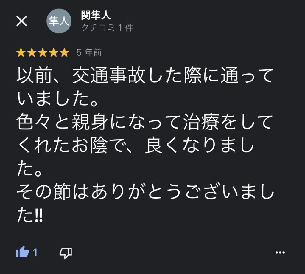 私も2015年に交通事故に遭い交通事故の辛さを知りました。そこから私と同じ思いをされないように交通事故のむち打ち治療に力を入れています。