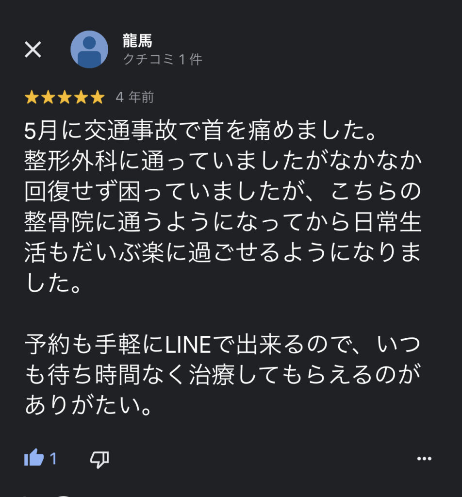 私も2015年に交通事故に遭い交通事故の辛さを知りました。そこから私と同じ思いをされないように交通事故のむち打ち治療に力を入れています。