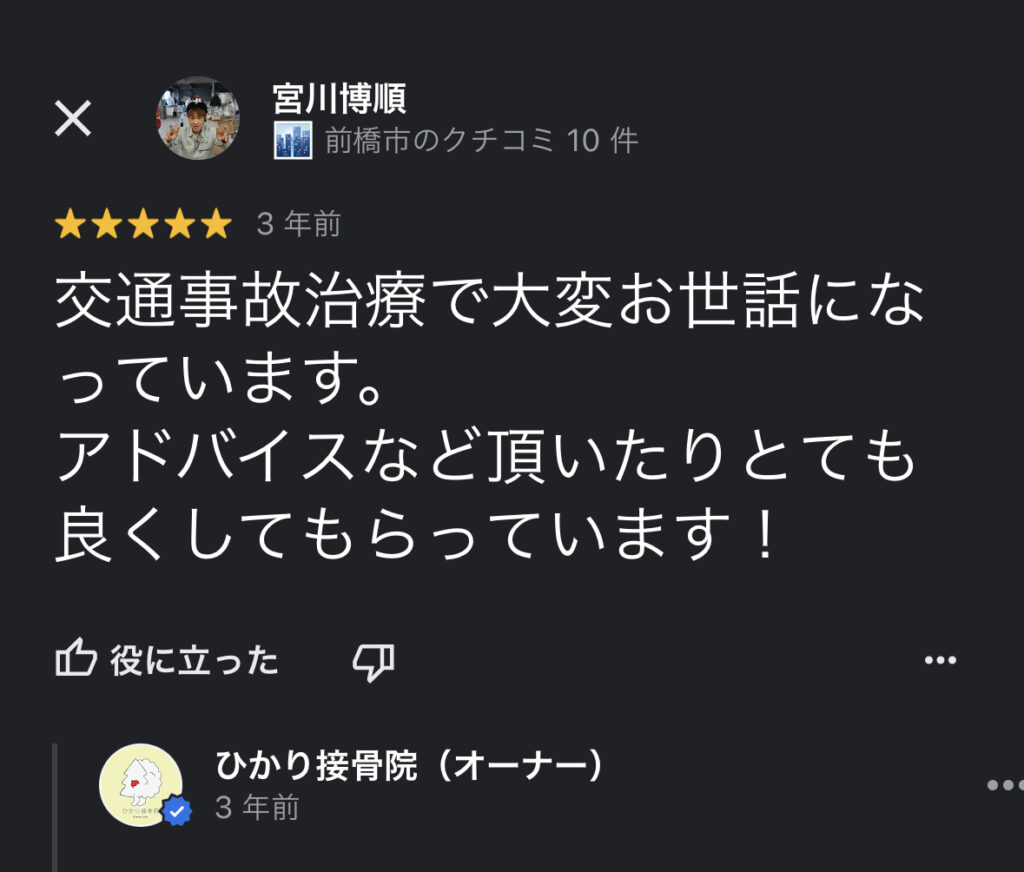 | ③保険会社・手続きに関する相談 | 「いつまで通えるのか」など、不安な点は一緒に整理します。保険会社とのやり取りもご相談に乗ります。 |
