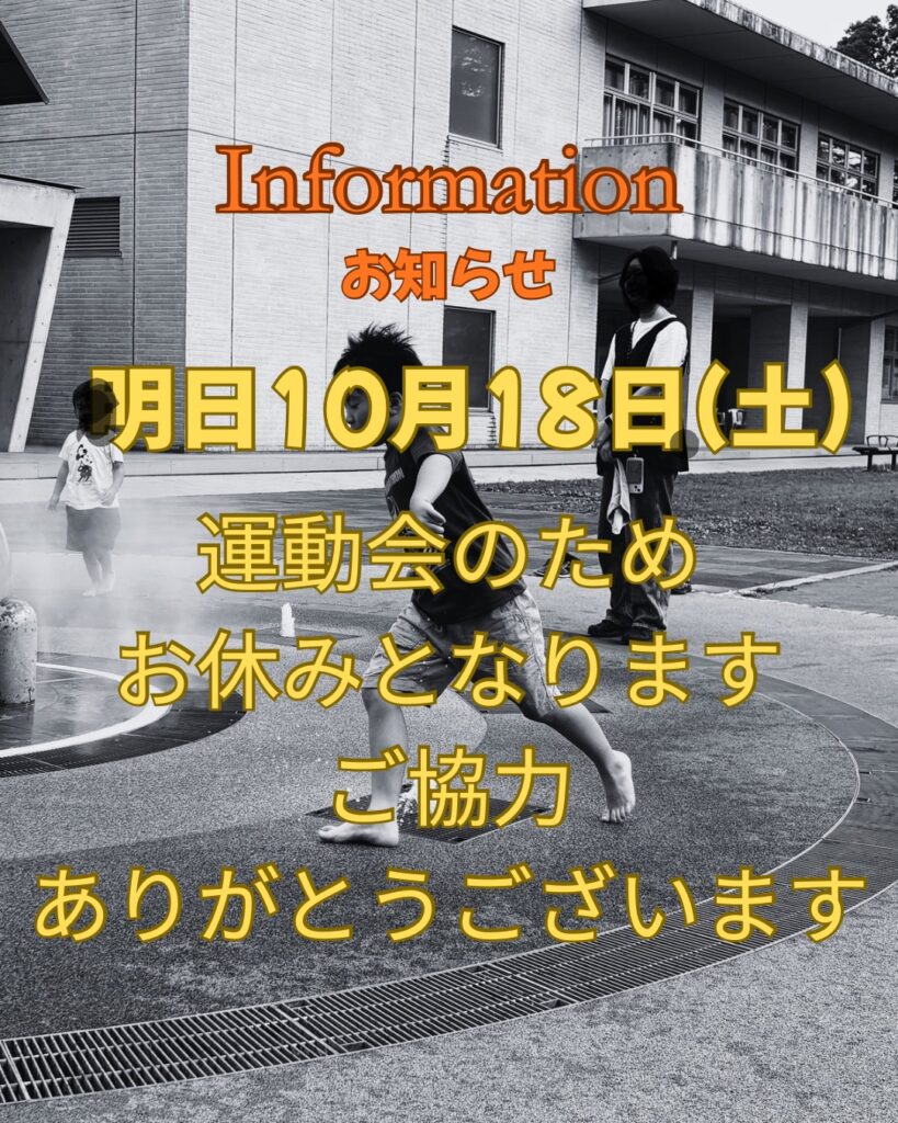 明日10月18日土曜日は息子の運動会のため、ひかり接骨院はお休みとなります。ご協力ありがとうございます。